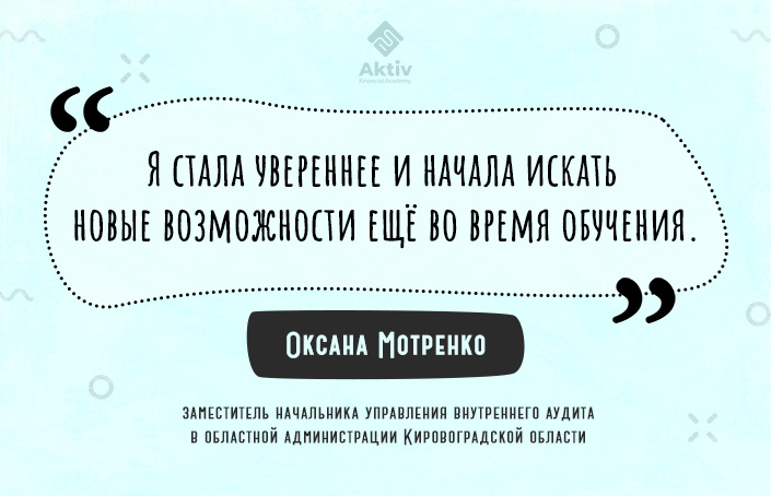 Оксана Мотренко — заместитель начальника управления внутреннего аудита Кировоградской ОГА — рассказывает, как обучение на курсе «ACPM: Профессиональный внутренний аудитор» помогло ей систематизировать знания. Победа в онлайн-марафоне по внутреннему аудиту стала для нее толчком к действиям. Госпожа Оксана делится своим опытом онлайн-обучения, сложными темами и моментами, когда пришлось сдавать экзамен в несколько нестандартной ситуации. Сегодня выпускница применяет новые знания на практике и работает над созданием собственной методички для проверок в своем управлении.