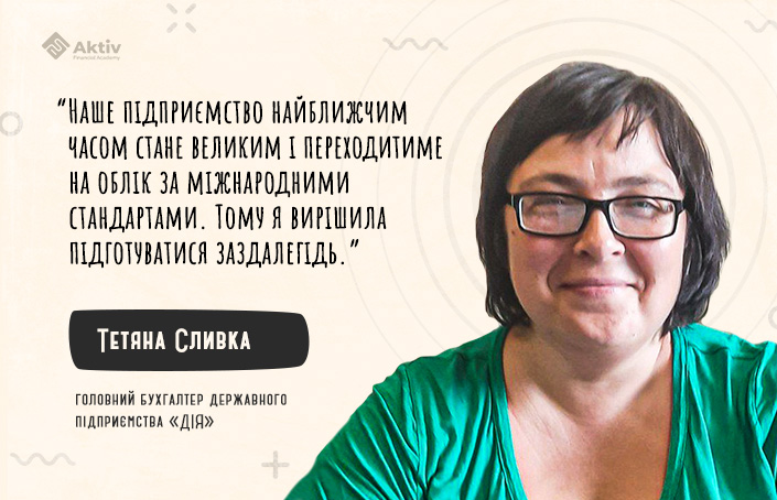 Наше підприємство найближчим часом стане великим і переходитиме на облік за міжнародними стандартами. Тому я вирішила підготуватися заздалегідь. Це була виключно моя ініціатива. Навчання я також оплачувала самостійно.