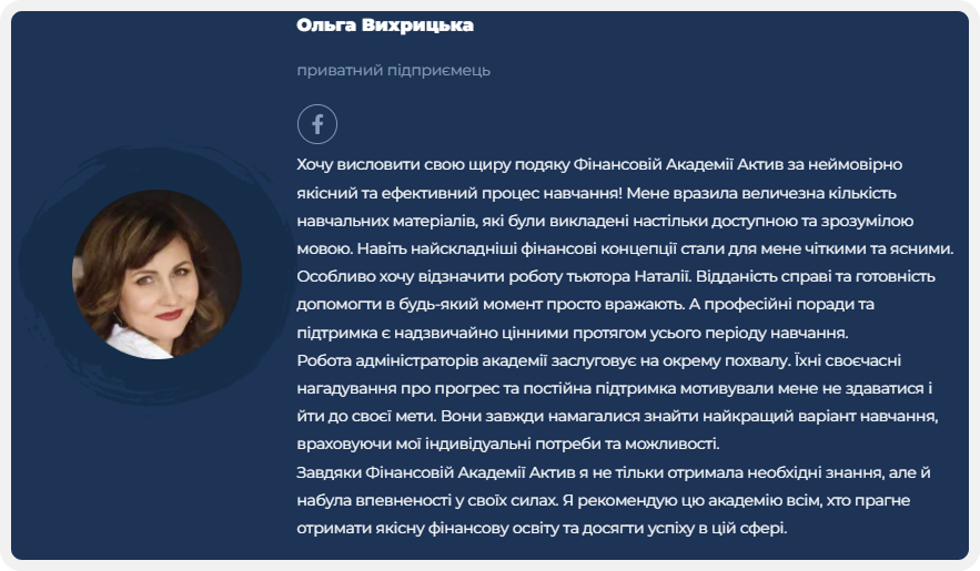 Провідний тьютор у Фінансовій Академії Актив. Професор, доктор економічних наук. Експерт-практик з досвідом роботи в органах Державного казначейства України, викладання семінарів для бухгалтерів та аудиторів. Стаж науково-викладацької діяльності – понад 20 років. Автор та співавтор 7 монографій, 5 наукових посібників та підручника, понад 15 навчально-методичних видань та 45 наукових праць у фахових виданнях з обліку та аудиту.